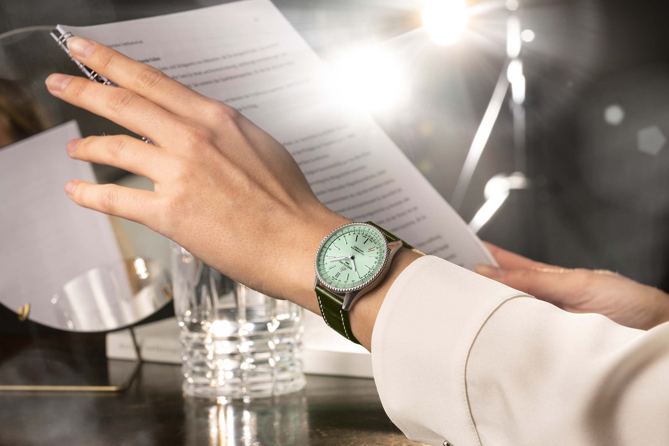 La Navitimer 36 mm est dotée de la lunette perlée et de la règle à calcul circulaire emblématique (utilisée par les pilotes comme un calculateur analogique) qui confèrent à la Navitimer son caractère reconnaissable entre mille. Elle se décline désormais en trois couleurs de cadran métalliques élégants (vert menthe, argent et anthracite) avec des index bâtons ou avec un cadran en nacre blanche serti de « meilleurs diamants » en forme de rond.